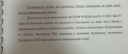 Це будівництво досі не затверджене депутатами Київради в межах Міської цільової програми з розвитку транспортної інфраструктури, тому не зрозуміло, як взагалі можна було витрачатися на розробку для нього ТЕО. У Кличка, розпорядження якого і виконували в Дирекції, схоже, просто вирішили форсувати події та без погодження депутатів витратити гроші на проєкт дороги. Не дивлячись на те, що вона фактично розріже екопарк "Осокорки" на чотири частини і знищить його цілісність.