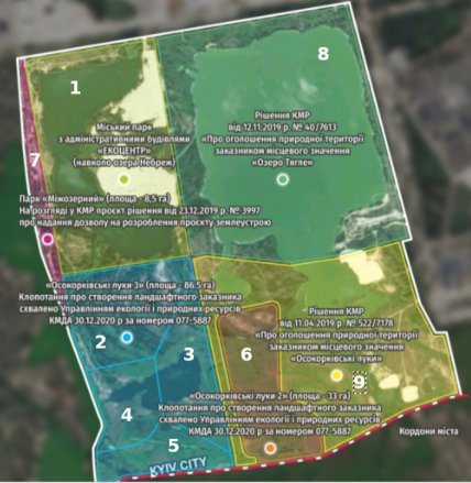 Для кращого розуміння ситуації наведемо детальний план розташування ділянок, переданий "Телеграфу" ГО "Екопарк Осокорки", з якого видно, якою є ситуація станом на початок осені 2024 року.