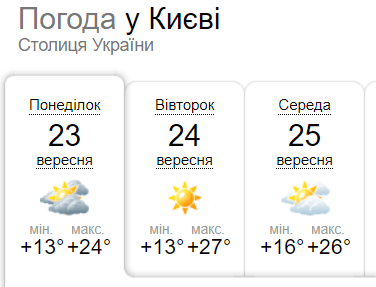 Хмарність у середу, 25 вересня, передбачається лише вранці та у денний час. Опадів не прогнозується. Температура вдень сягне +26 градусів, а вночі опуститься до +16 градусів. Максимальна сила вітру прогнозується на початку другої половини доби — легкі 2 м/с.