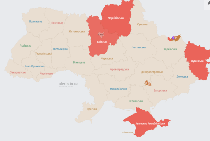 На оновленій карті тривог видно, що під загрозою зараз перебувають Київська, Чернігівська та Луганська області.
