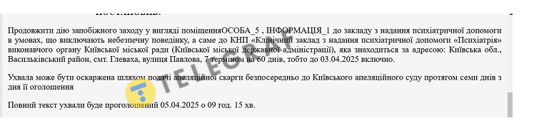 Суд нещодавно ухвалив рішення про продовження запобіжного заходу для злочинця, якого помістили до психіатричного закладу "Психіатрія" у смт Глеваха. Він мав залишатися під наглядом лікарів 60 днів – до 3 квітня 2025 року. Про це пише видання Київщина 24/7