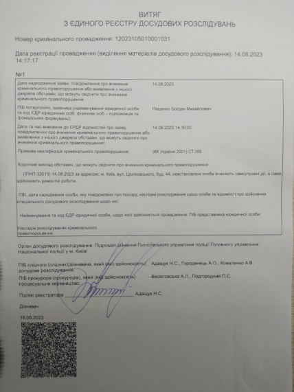 Ще одне кримінальне провадження ведеться за статтею 198 Кримінального кодексу України (Самоуправство) через незаконне будівництво Рябчуна за адресою вулиця Ціолковського, 44.