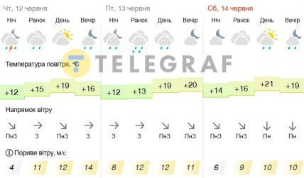 У четвер, 12 червня, вночі пройшов дрібний дощ разом з грозами. Опади ще мають протриматись вранці та ввечері, а вдень візьмуть перерву. Повітря вдень прогріється до +19 градусів, а вночі охолонуло до +12 градусів. Упродовж ранку-вечора очікуються сильні-міцні вітри — до 11-14 м/с.