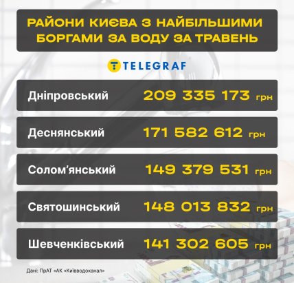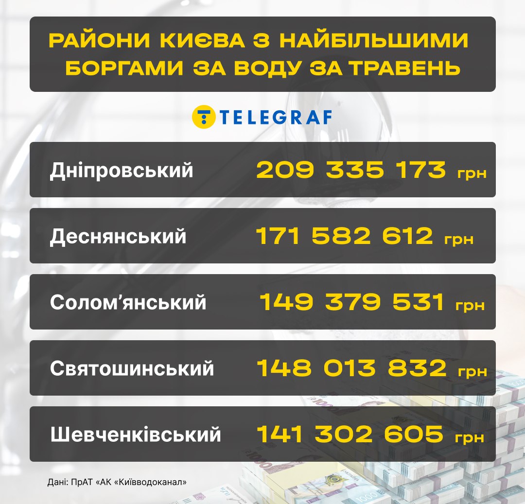 Серед районів лідерами за сумами несплати є Дніпровський (понад 209 млн грн у травні), Деснянський (171,5 млн грн) та Солом’янський (149,3 млн грн). Мешканці Шевченківського району заборгували понад 141 млн грн, Оболонського майже – 128 мільйонів.