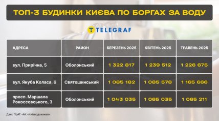 Показники по окремих адресах демонструють хронічну несплату. У трійку будинків із найбільшими боргами входять: вул. Прирічна, 5 (Оболонський р-н), де на травень заборгованість перевищила 1,22 млн грн; вул. Якуба Коласа, 6 (Святошинський р-н) — понад 1,16 млн грн; та просп. Маршала Рокоссовського, 3 (також Оболонський р-н) — 1,065 млн грн.