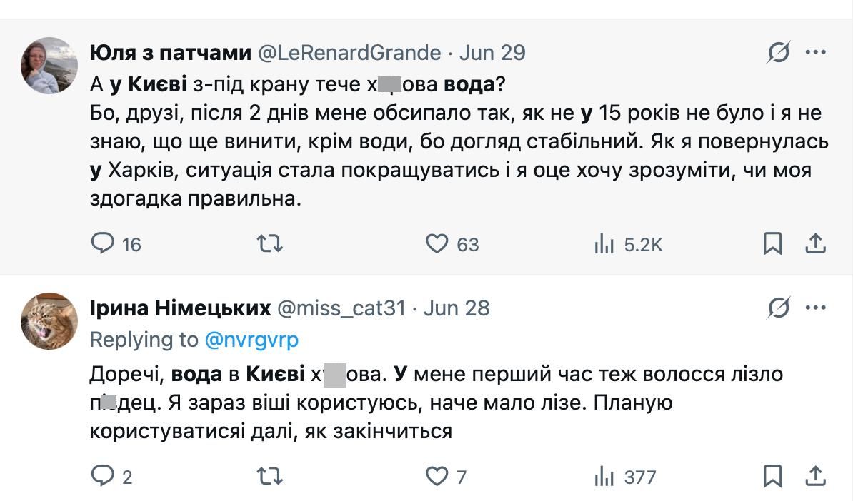 Користувачі соцмережі X теж кажуть, що проблема з водою у столиці системна, а через її якість нерідко бувають проблеми з випаданням волосся або висипом на обличчі.
