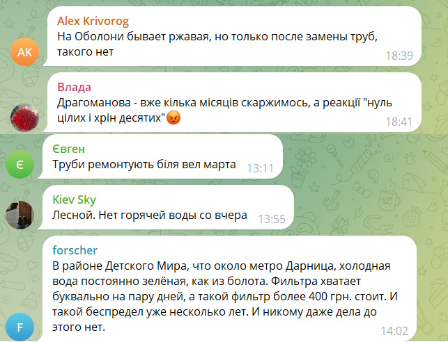 При цьому деякі користувачі мережі зазначають, що місцями проблема спостерігається вже тривалий час, а скарги влада не почула. Згідно з повідомленням кореспондентів "Телеграфа" у деяких районах вода має характерний "рибний" запах.