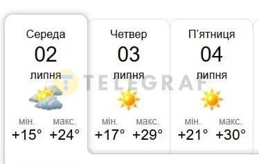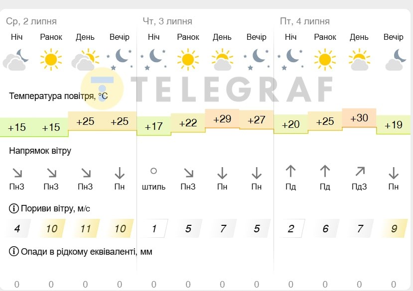Температура на термометрах у денний час перебуватиме в коридорі +24…30 градусів, тоді як в нічний — +15…21 градусів. Сила вітру своєю чергою в ці дні не сягне вище легких 3,6 м/с.
