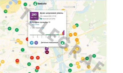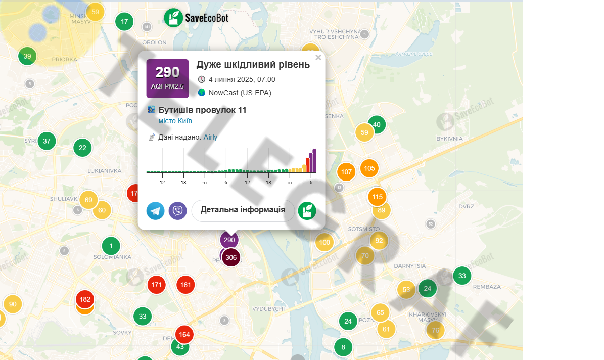 За адресою Бутишів провулок, 11 рівень забрудненості повітря також дуже високий — 290 PM2.5. Це оцінюється як дуже нездорове повітря.