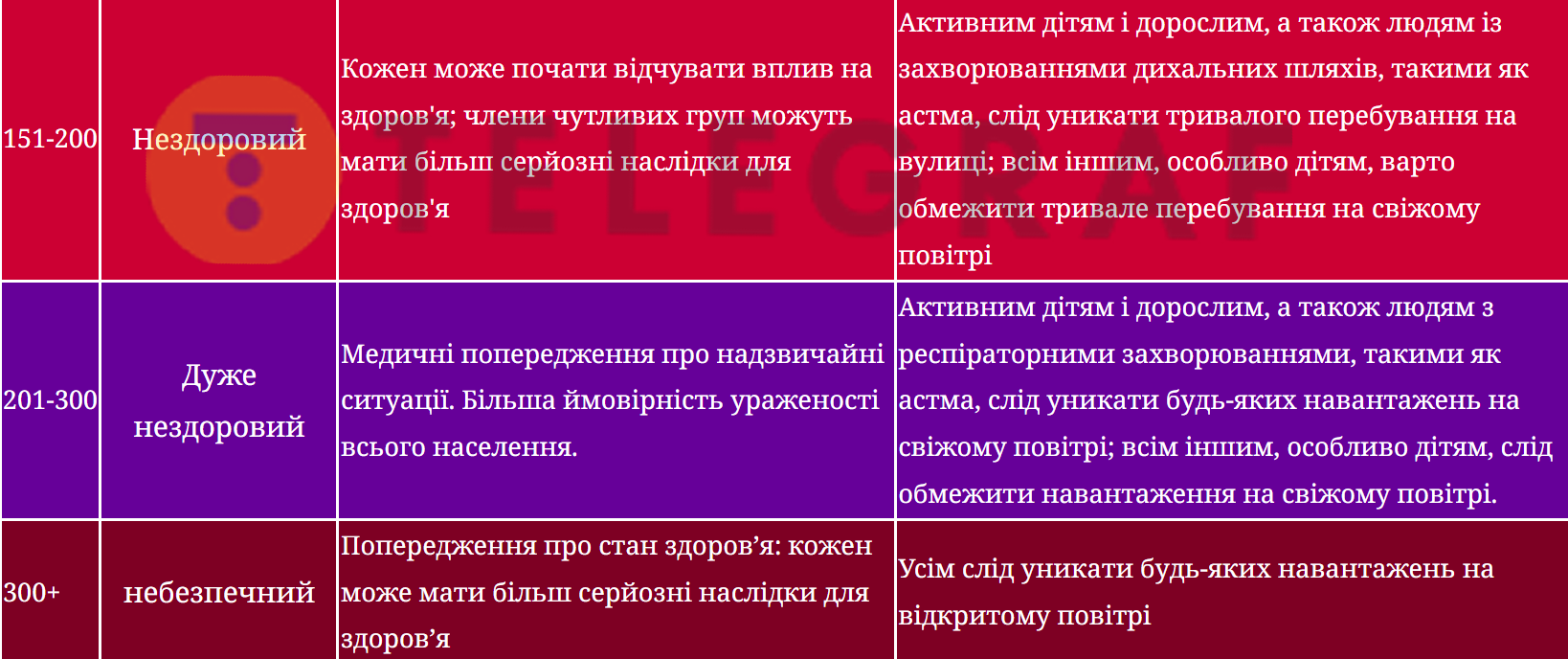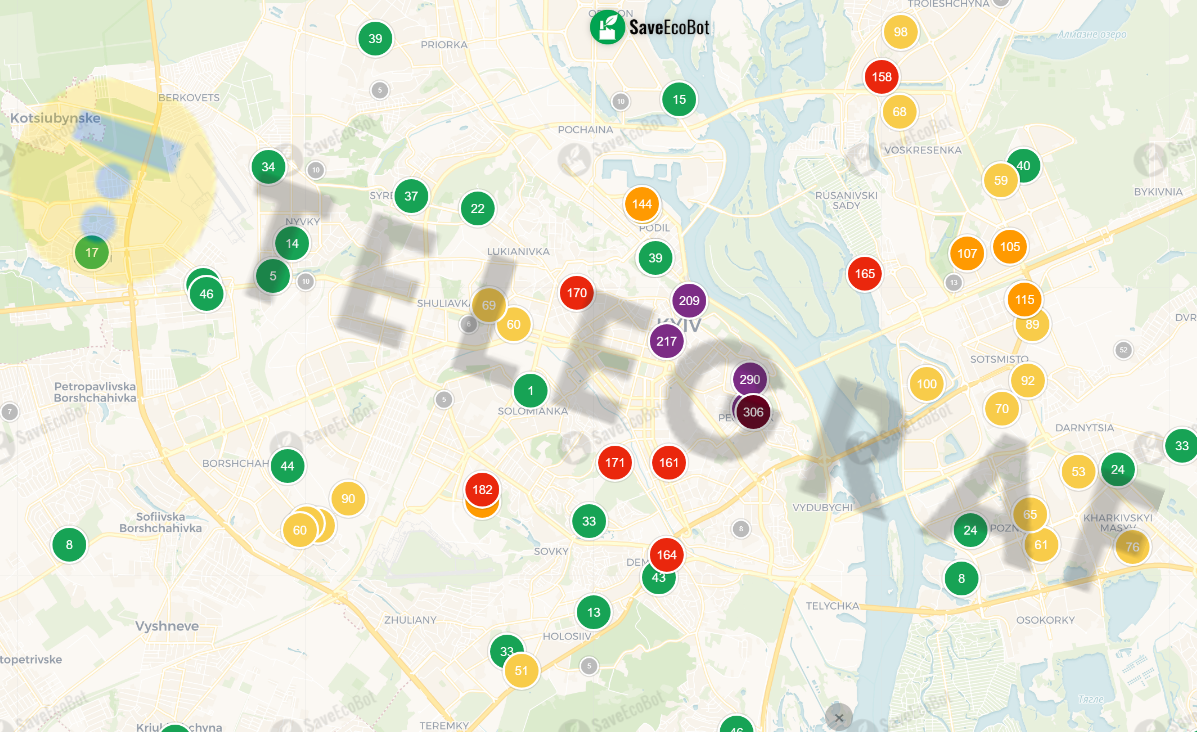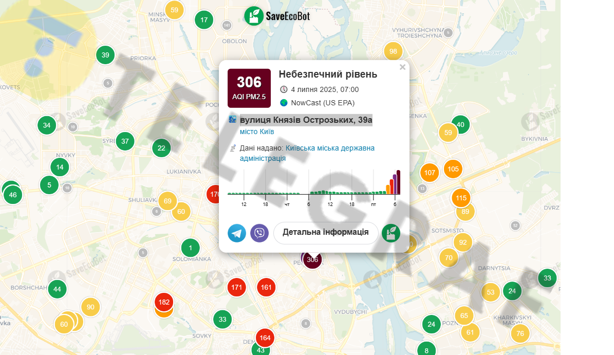 За даними сайту SaveEcoBot, найгірша якість повітря зафіксована на вулиці Князів Острозьких, 39А (Печерський район) — 306 AQI PM2.5. Показник забрудненості повітря у понад 300 одиниць оцінюється як небезпечний, таке повітря вкрай негативно впливає на людей.