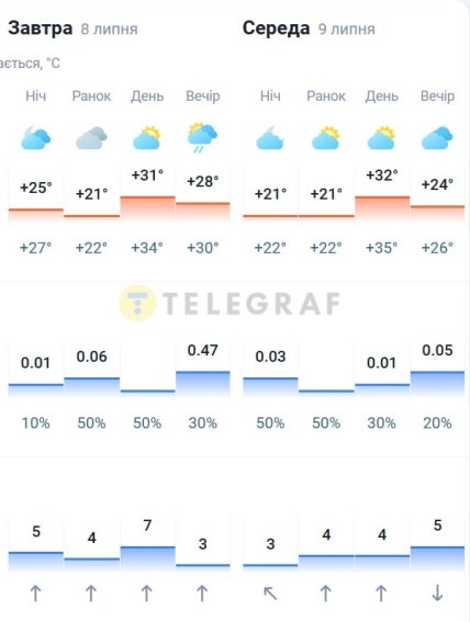 У Мета.Погода ж не очікують у вівторок тривалих дощів. Вони, за їх прогнозом, йтимуть тільки ввечері. Мінлива хмарність своєю чергою триматиметься 8 та 9 липня.