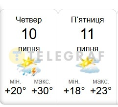 За прогнозом Sinoptik, у четвер, 10 липня, у місті очікується мінлива хмарність, а вдень та ввечері йтиме сильний дощ із грозою. Наступного дня збережеться лише невелика хмарність.