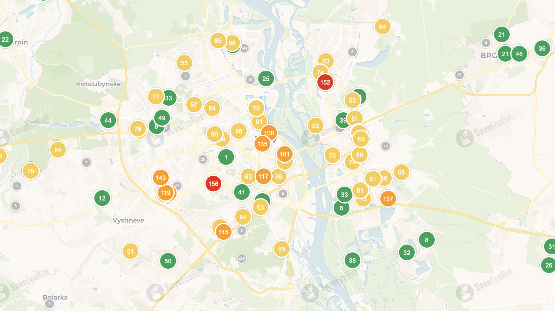 Дані з якістю повітря наводить портал Saveecobot. На карті видно, що відбувається.
