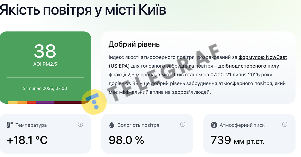 Там зазначається, що станом на 07:00 індекс якості атмосферного повітря у столиці становить 38 балів за шкалою AQI PM2.5, що відповідає "доброму рівню" забруднення з мінімальним впливом на здоров'я киян.