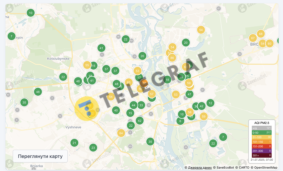 За даними інтерактивної карти моніторингу якості повітря, попри нічні обстріли, екологічна ситуація в місті не зазнала критичного погіршення. Переважна більшість моніторингових станцій по всьому Києву фіксує показники в зеленій зоні — від 6 до 48 балів, що свідчить про задовільний стан атмосфери.