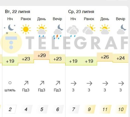 Повітря у денний час має прогрітись від +26 до +29 градусів, а вночі — охолонути до +19 градусів. Найсильніші вітри передбачаються тільки 23 липня — свіжі-сильні 9-11 м/с.