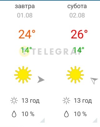 За прогнозом в Погода&Радар та Sinoptik, температура вдень сягатиме близько +24…26 °C. Вночі ж вона опускатиметься до +14…17 °C.