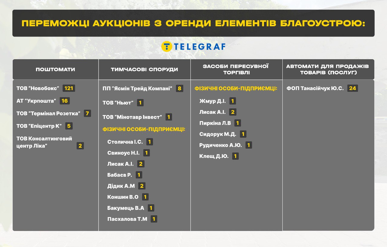 Ще по 1 аукціону на розміщення тимчасових споруд виграли ТОВ "Ньют" (основний вид діяльності "рекламна діяльність", бенефіціари – Валентина та Сергій Брежнєви, Євген Горбунов) та "Мінотавр Інвест" (основний вид діяльності "надання в оренду й експлуатацію власного чи орендованого нерухомого майна", бенефіціари – Євгенія Розбицька та Дмитро Шкляр). Плюс у восьми торгах переможцями стали фізичні особи підприємці – по 1 разу Столична І.С., Свиноус Н.І., Бабаєв Р., Коншин В.О., Бакумець В.А. та Пасхалова Т.М., а 2 рази – Дідик А.М. А засоби пересувної торгівлі крім згаданої підприємиці Антоніни Лисак зможуть розмістити в Оболонському та Печерському районах ФОПи – Жмур Д.І., Пиркіна Л.В., Сидорчук М.Д., Рудиченко А.Ю. та Клещ Д.Ю.