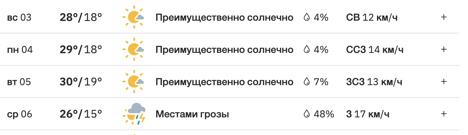 У неділю, 3 серпня, вдень повітря прогріється до +27 градусів, а вночі стовпчик термометра опуститься до +18 градусів. Опадів на цей день синоптики не прогнозують, сила вітру становитиме до 12 м/с.