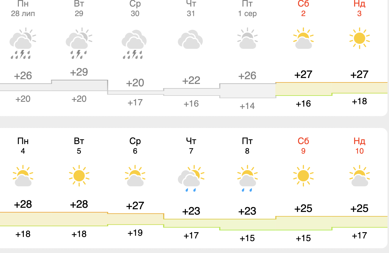 На вихідні, 9-10 серпня, синоптики не обіцяють дощів, буде помірна хмарність та сонячно. Повітря вдень прогріється до +25 градусів, а вночі охолоне аж до +15 градусів.