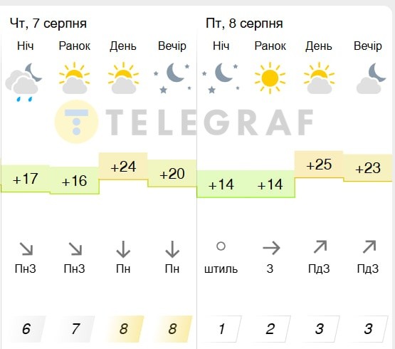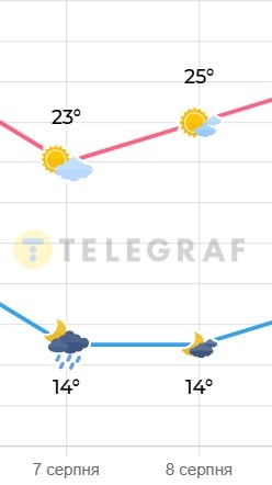 Температура вдень протягом 7-8 серпня очікується в межах +23…25 градусів, а вночі показники впадуть до +14 градусів, як передали в Українському гідрометеорологічному центрі та Meteofor.