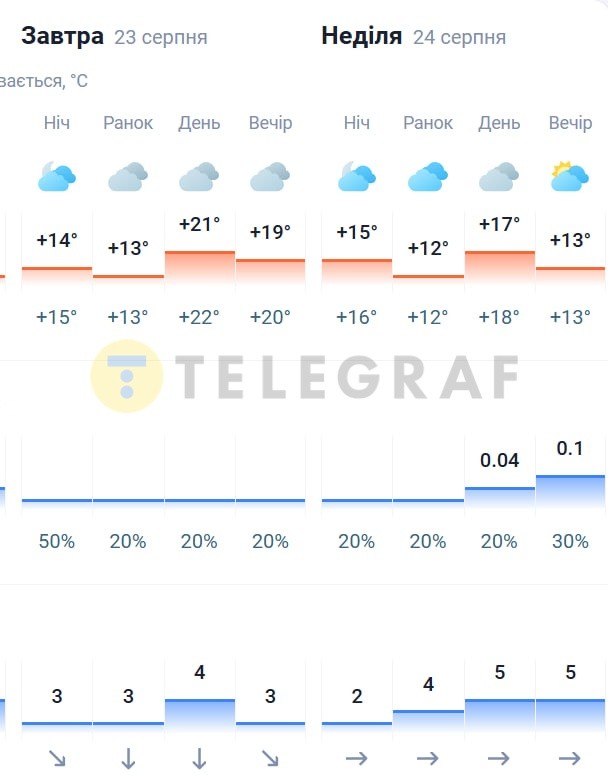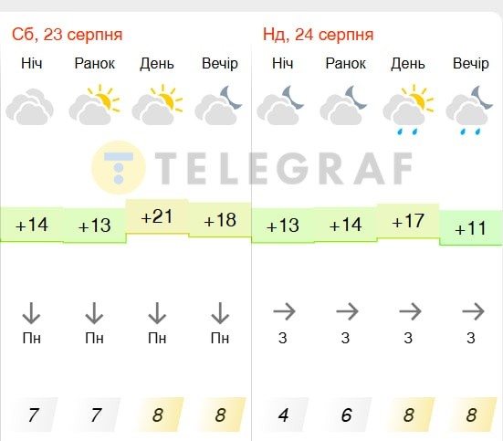 Тим часом температура вдень спочатку сягне +21 градусу, а пізніше опуститься до +17 градусів, хоча вночі буде +14…15 градусів. Вітри тим часом не розгуляються більше слабких 5 м/с.