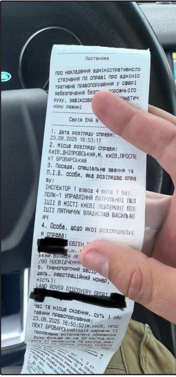 Військовослужбовці повідомили, що виконують бойове завдання, але лейтенант поліції наполягав на складанні протоколу та відмовився приєднуватися до заходів щодо захисту міста від повітряної загрози. На прикріпленому фото видно, що постанова була видана 23 серпня о 16:53.