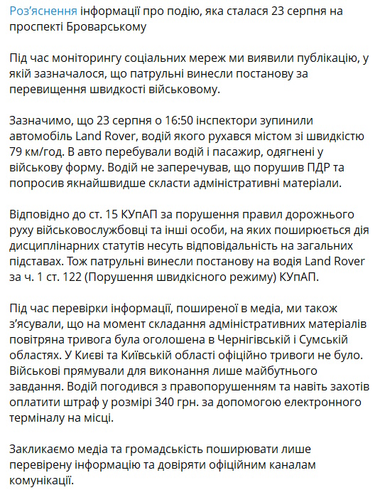 У поліції після цього пояснили, що на момент складання протоколу у Києві та області тривога оголошена не була. Там нагадали, що військовослужбовці також несуть відповідальність за порушення правил дорожнього руху, як і цивільні.