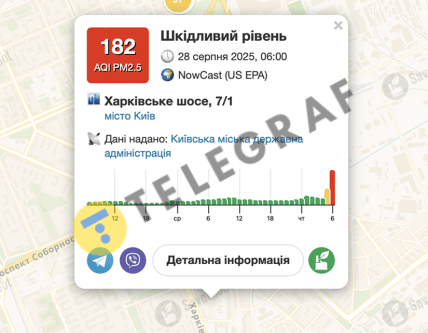 Такі показники вказують на серйозне погіршення якості повітря в результаті пожеж та димових викидів після ворожих обстрілів. Графік моніторингу показує різкий стрибок забруднення, що почався в ранкові години 28 серпня.