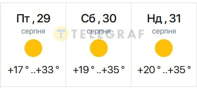 Як кажуть у Meteofor, у п'ятницю-неділю, 29-31 серпня, погода "потішить" киян спекою та безхмарністю. Денна температура наприкінці вересня очікується в межах +29…31 градусу, а нічна — +17…18 градусів.