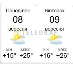 За даними Sinoptik, у понеділок та вівторок на небі плаватимуть хмари. Однак опадів не передбачається. Повітря у денний час має прогрітись до +25…26 градусів, а в нічний — охолонути до +15…16 градусів.