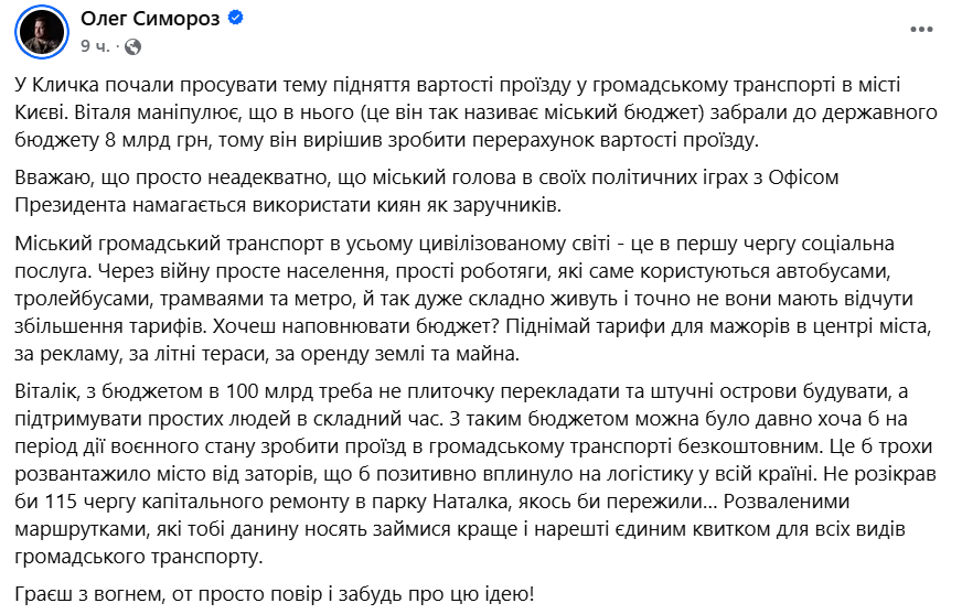 У Кличка почали просувати тему підняття вартості проїзду у громадському транспорті в місті Києві, стверджує активіст та правозахисник Олег Симороз. За його словами, мер міста маніпулює, пояснюючи необхідність перерахунку вартості проїзду тим, що в нього забрали до державного бюджету 8 млрд грн.