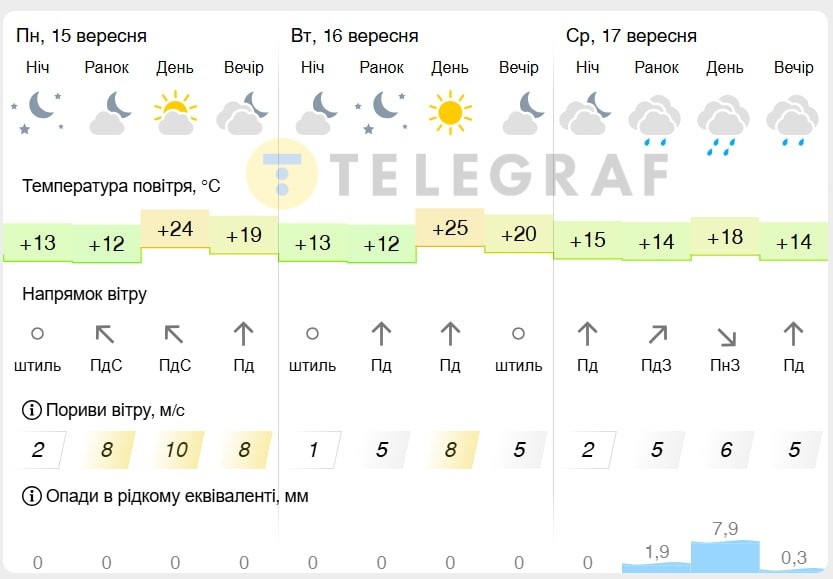 Денна температура сягне +20…24 градусів, тоді як нічна опуститься до +13 градусів. Водночас за цим прогнозом найсильніші вітри вируватимуть у середу — свіжі 8 м/с.
