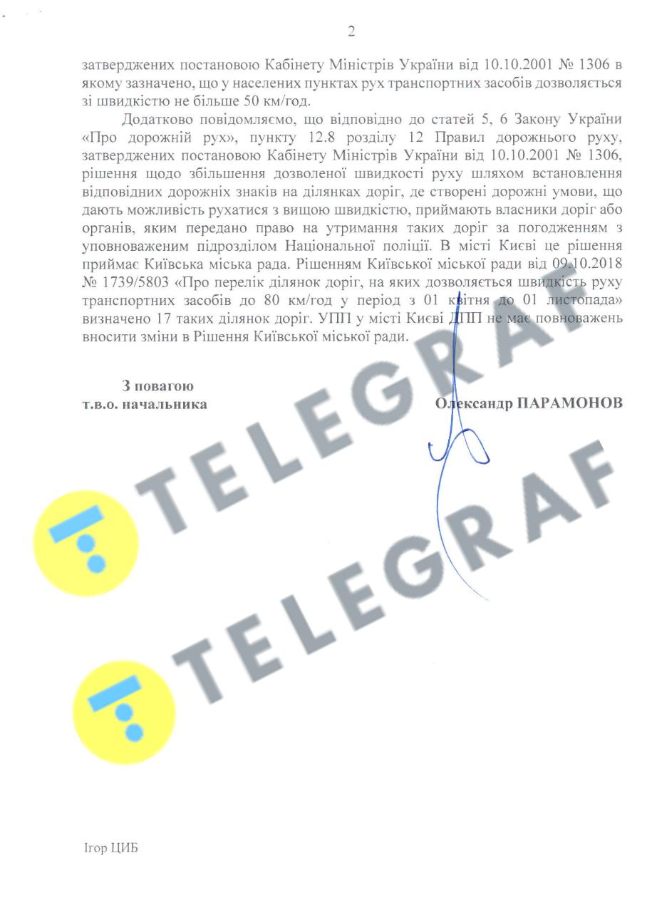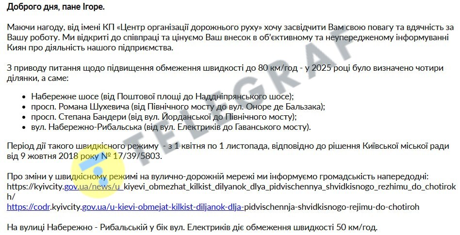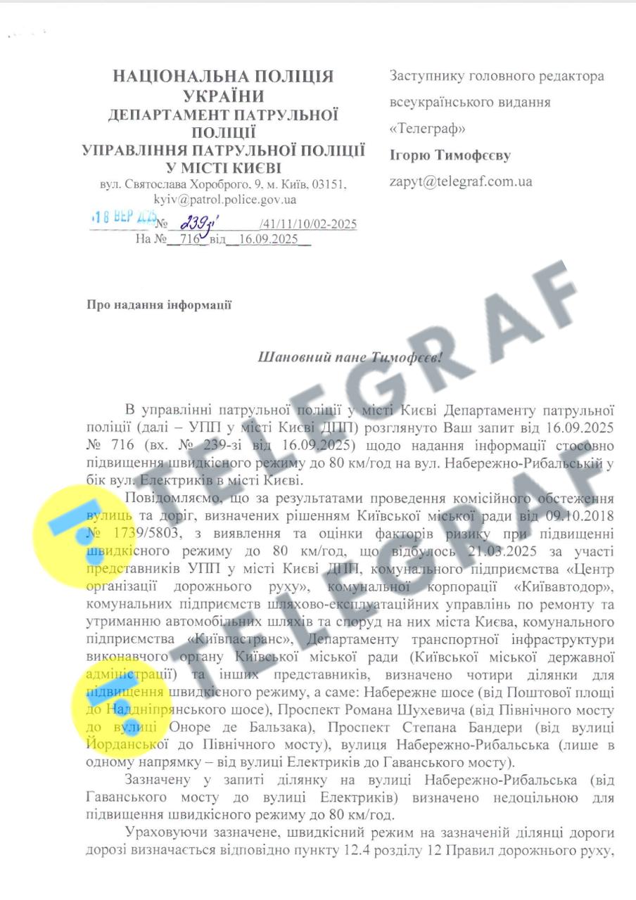У відповідь на наш запит було зазначено, що новий швидкісний режим було визначено лише для чотирьох вулиць Києва і Набережна-Рибальська (в напрямку вул. Електриків) не входить у цей перелік.