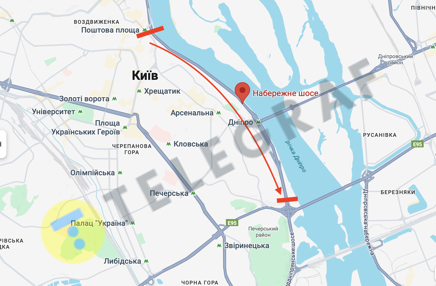 - Набережне шосе (від Поштової площі до Наддніпрянського шосе);