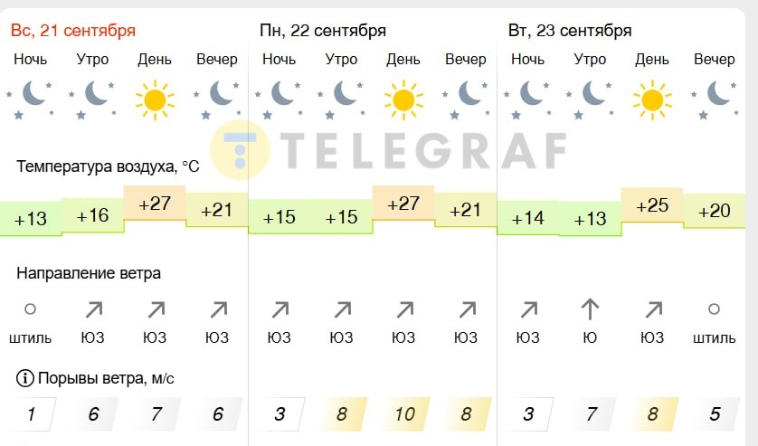 Тож, неділя, 21 вересня, пройде ясною та теплою, за даними Meteofor. Такими самим очікуються і понеділок-вівторок, 22 та 23 вересня. Водночас температура вдень має підскочити до +25…27 градусів, а вночі — опуститись до +13…15 градусів. Найсильніші вітри вируватимуть на початку тижня — свіжі 8-10 м/с.