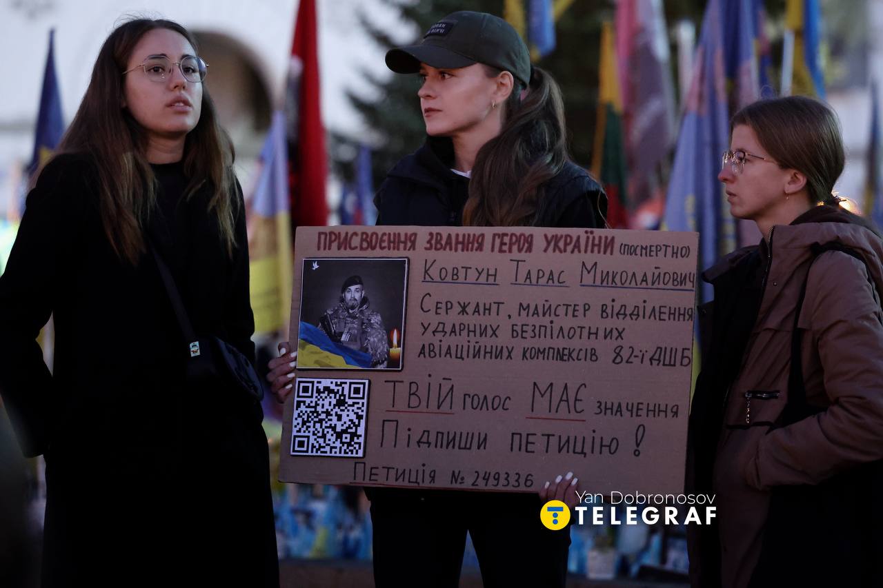 Вся ця подія на Майдані була просякнута болем та горем. Чимало людей плакати та тихо мовчали. Були і ті, хто на плакатах вказували номер петиції на присвоєння військовим звання Героя України. До прикладу, рідні просять небайдужих підписати петицію про Ковтуна Тараса.
