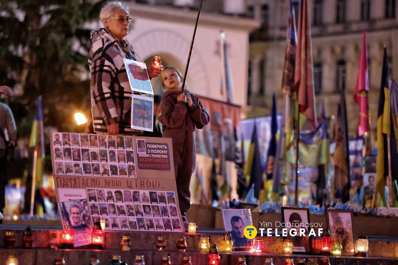 Чимало українців принесло плакати з фото з загиблими чи полоненими. Досить багато було і плакатів з закликами звільнити з полону "азовців" і не тільки. Люди виставляли фото військових з певними написами біля свічок. Хтось вказував позивний та дату загибелі, а хтось просто фото з підписом "Досі в полоні".