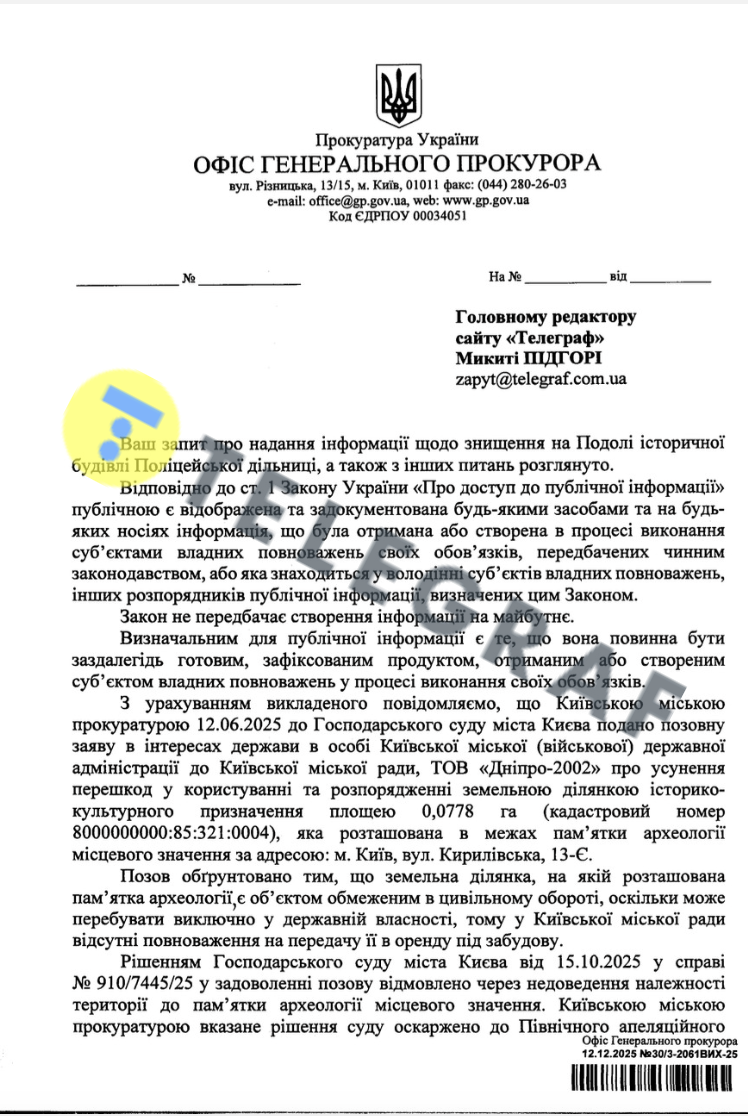 Подільська прокуратура міста Києва відкрила кримінальне провадження та подала клопотання про накладення арешту на 4 земельні ділянки, на яких проводить або планує проводити роботи ТОВ "Дніпро-2002".
