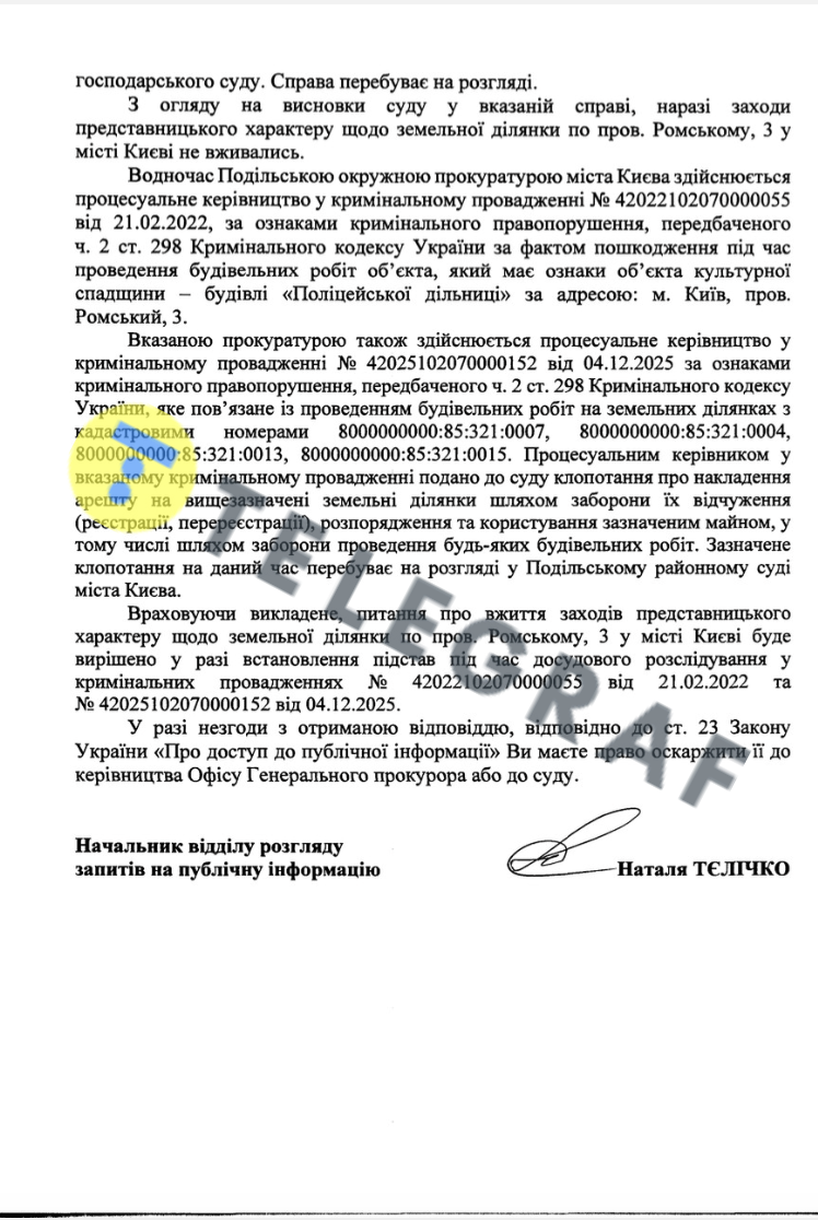Як зазначається у відповіді Офісу генпрокурора, арешт ділянок (кадастрові номери 8000000000:85:321:0007, 8000000000:85:321:0004, 8000000000:85:321:0013, 8000000000:85:321:0015) планується здійснити у межах свіжого кримінального провадження — №42025102070000152 від 04.12.2025. Його відкрито за ознаками кримінального правопорушення, передбаченого ч. 2 ст. 298 КК (умисне незаконне знищення, руйнування або пошкодження об'єктів культурної спадщини чи їх частин). Відповідальність – від штрафів, до 3 років обмеження волі.