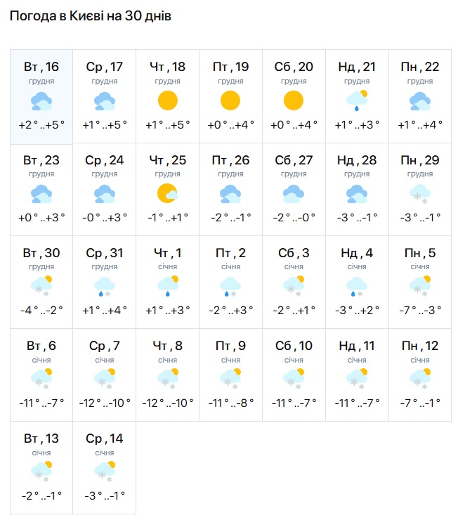 За даними погодного сайту meteo.ua, з 5 по 12 січня столицю може накрити серйозне похолодання. Стовпчики термометрів у цей період можуть опуститися до -10-12 градусів. Супроводжувати зміну погоди усі ці дні можуть опади у вигляді снігу.