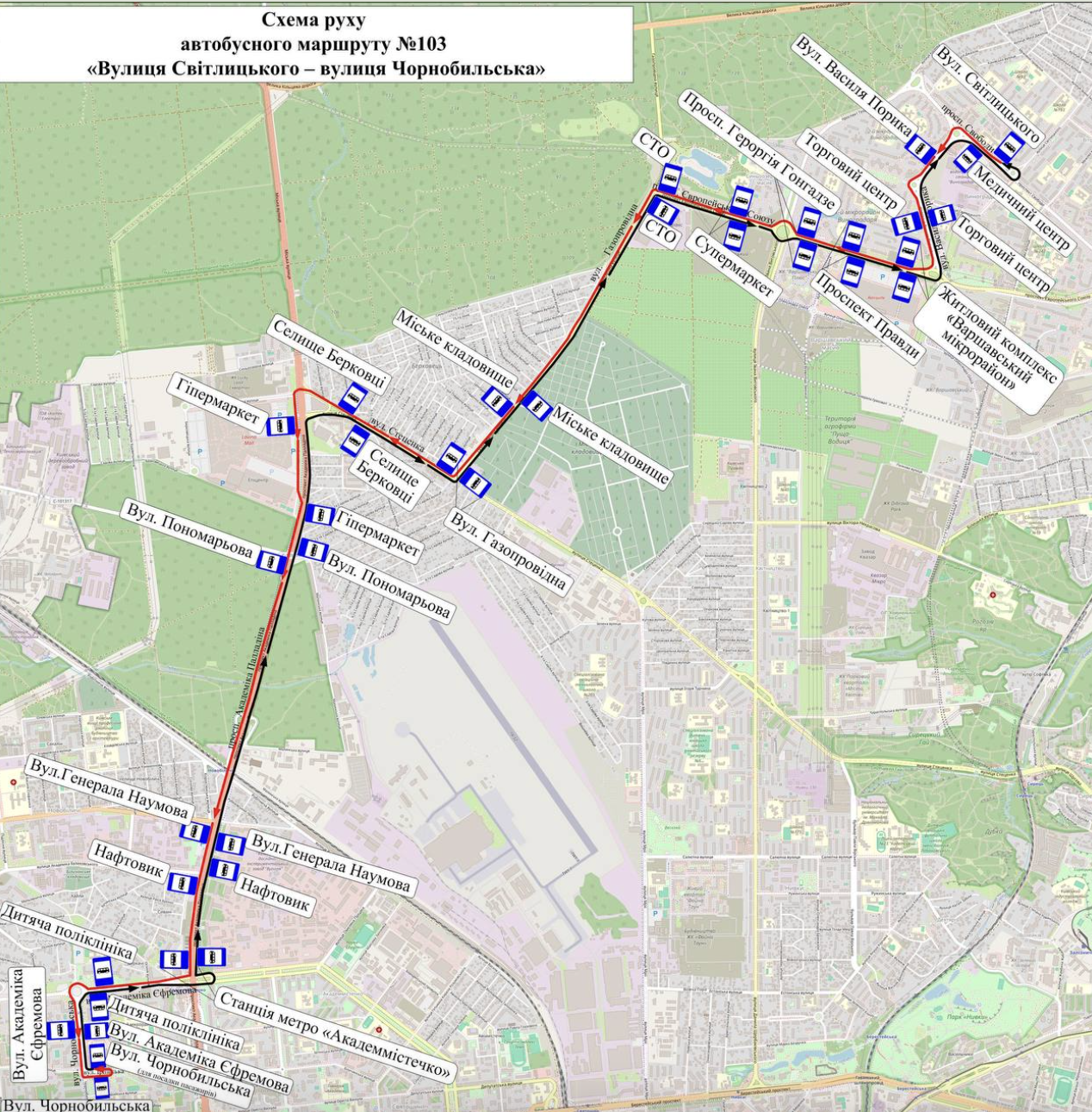 Схема руху 103 маршруту в Києві. Фото: КМДА