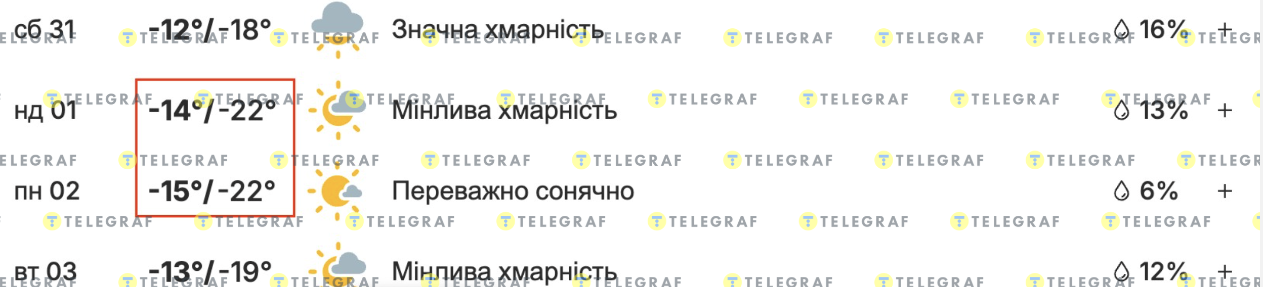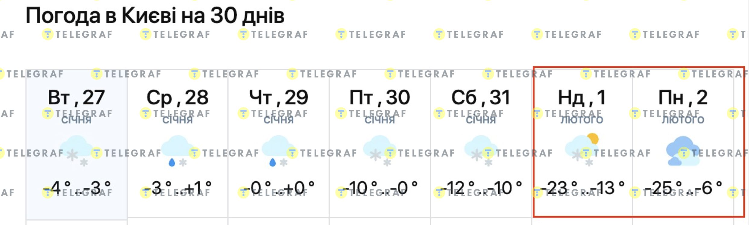 Водночас портал weather.com також прогнозує сильні морози в Києві, але на 2 та 3 лютого. Термометр показуватиме до -22 градусів вночі та -13 градусів вдень. Схожі дані публікує meteofor.com.ua на 2 та 3 лютого — до -22 градусів.