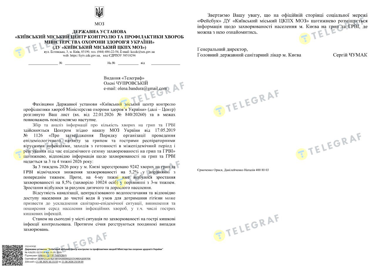 Про це йдеться у відповіді Державної установи "Київський міський центр контролю профілактики хвороб Міністерства охорони здоров’я України" на запит "Телеграфу".