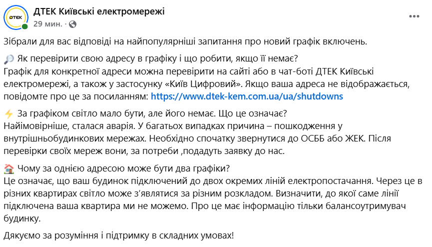 Графік для конкретної адреси можна перевірити на сайті або в чат-боті ДТЕК Київські електромережі, а також у застосунку "Київ Цифровий". Якщо ваша адреса не відображається, повідомте про це за посиланням: https://www.dtek-kem.com.ua/ua/shutdowns
