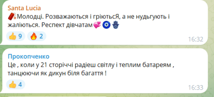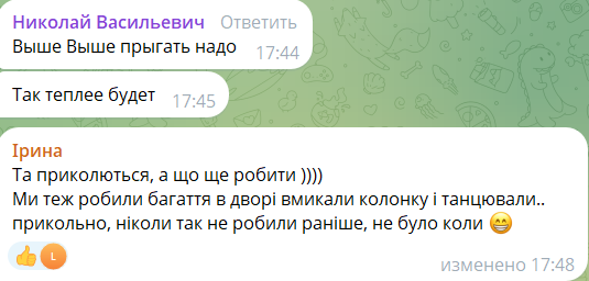 У Києві місцеві жителі розпалили на вулиці велике багаття та танцювали навколо нього, щоб зігрітися. Швидше за все це сталося неподалік однієї з ТЕЦ, оскільки в кадр потрапила труба.