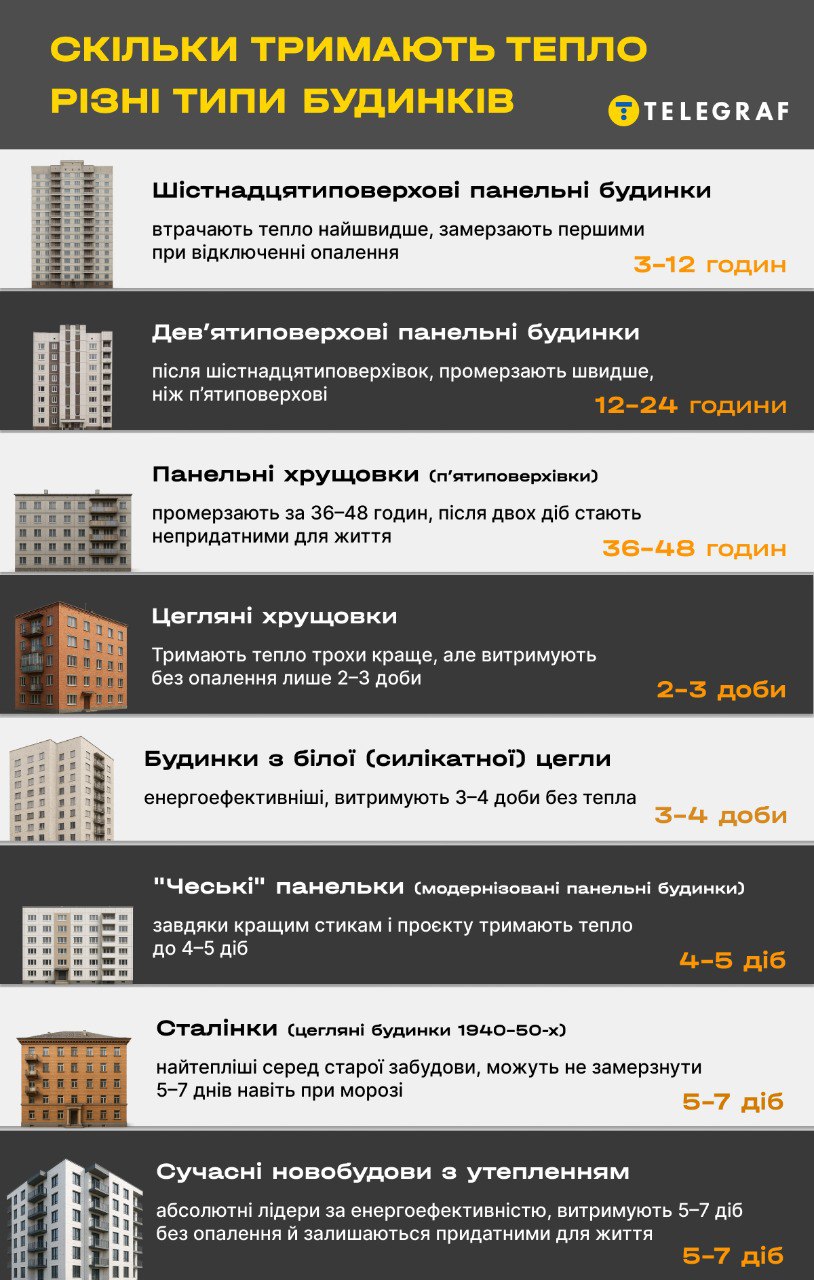 Додамо, що найсильніше відключення та блекаут можуть вдарити по будинках, де електропалення. Однак слід розуміти: якщо російський удар виведе з ладу частину енергооб'єктів та відбудеться аварійне відключення, котельні також не зможуть працювати, адже не всі мають генератори. Таким чином деякі будинки, враховуючи особливості їх побудови, можуть замерзнути за лічені години.