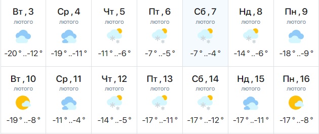Так, у першій декаді лютого у більшій частині областей, крім південних, знову очікуються морози до -20 °C. З 8-10 лютого морози почнуть поступово слабшати, хоча на північному заході холодна погода, мабуть, протримається майже до кінця місяця.
