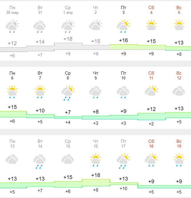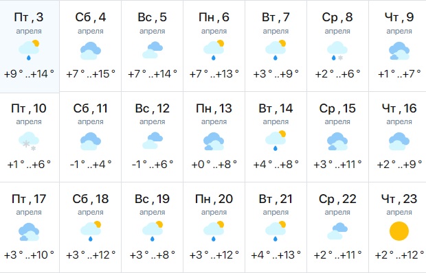 Такий прогноз дає і погодний сервіс Meteo.ua. За їхніми розрахунками, з 7 по 13 квітня стовпчики термометрів у Києві можуть опускатися навіть нижче за нуль (вночі) — -1+9 градусів. У деякі дні можливі дощі чи мокрий сніг.