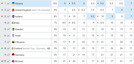 За даними сайту eurovisionworld, таблиці букмекерських ставок, Україна отримала ймовірність першого місця в 10%. Ісландія, яка раніше займала перший рядок, опустилася на третє місце з оцінкою в 8%.